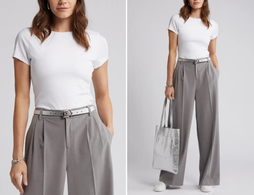 A white tee is one of the easiest pieces to elevate. It works well with trousers, skirts, and even shorts when styled the right way. You can tuck it into pleated pants for a clean and polished pairing.